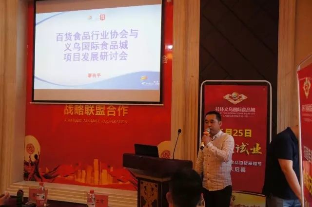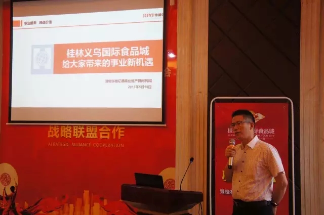 最后,桂林義烏食品城戰(zhàn)略顧問(wèn)機(jī)構(gòu)深圳華錦億爵商業(yè)地產(chǎn)顧問(wèn)機(jī)構(gòu)謝金杏先生就桂林義烏國(guó)際食品城將給大家?guī)?lái)什么樣的事業(yè)新機(jī)遇展開(kāi)發(fā)言,謝總分別闡述了食品城的項(xiàng)目定位、桂林食品百貨行業(yè)批發(fā)市場(chǎng)現(xiàn)狀、項(xiàng)目商業(yè)規(guī)劃、運(yùn)營(yíng)模式、以及項(xiàng)目將給大家?guī)?lái)什么機(jī)遇五個(gè)要點(diǎn)展開(kāi)。重點(diǎn)闡述了作為商家進(jìn)駐義烏食品城的長(zhǎng)期收益。最后謝金杏先生表示在食品城、行業(yè)協(xié)會(huì)、顧問(wèn)機(jī)構(gòu)、VIP商戶的共同努力下,把桂林義烏國(guó)際食品城打造為桂林市顛覆傳統(tǒng)規(guī)模最大的食品百貨批發(fā)大市場(chǎng)。