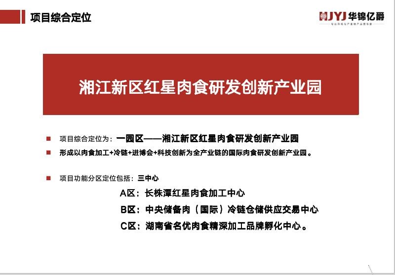 項(xiàng)目位于長(zhǎng)沙市岳麓區(qū)蓮花鎮(zhèn)片區(qū)。蓮花物聯(lián)港項(xiàng)目一期(蓮花片區(qū)地塊)凈用地面積354畝,容積率1.5.建筑面積為35.4萬(wàn)平米。規(guī)劃用地為專(zhuān)業(yè)市場(chǎng)物流倉(cāng)儲(chǔ)用地。華錦億爵公司負(fù)責(zé)該項(xiàng)目地塊的立項(xiàng)“長(zhǎng)沙農(nóng)副產(chǎn)品冷鏈物流園項(xiàng)目”的可研與整體策劃。經(jīng)過(guò)華錦億爵公司的專(zhuān)業(yè)市場(chǎng)調(diào)研與整體項(xiàng)目策劃、商業(yè)合作推薦,央企中鐵城建集團(tuán)與長(zhǎng)沙紅星農(nóng)批集團(tuán)展開(kāi)合作,該項(xiàng)目最終定位為:湘江新區(qū)紅星肉食研發(fā)創(chuàng)新產(chǎn)業(yè)園。其中包括“長(zhǎng)株潭紅星肉食加工中心”依托紅星實(shí)業(yè)集團(tuán),形成上下游產(chǎn)業(yè)鏈并建,集養(yǎng)殖、屠宰、精深加工、冷鏈物流與進(jìn)出口商貿(mào)流通等綜合肉類(lèi)產(chǎn)業(yè)服務(wù)集團(tuán);“中央儲(chǔ)備肉(國(guó)際)冷鏈倉(cāng)儲(chǔ)供應(yīng)交易中心”打造進(jìn)博會(huì)在湖南乃至中南地區(qū)的專(zhuān)業(yè)“肉食品冷鏈展示商貿(mào)中心”,集結(jié)算中心、檢測(cè)中心、服務(wù)中心、信息中心于一體,打造線(xiàn)上和線(xiàn)下相輔相成的創(chuàng)新業(yè)態(tài),并提供便捷的結(jié)算服務(wù)和金融支持;“湖南省名優(yōu)肉食精深加工研發(fā)孵化中心”以肉食品精深加工為引領(lǐng),通過(guò)引入湖南省名優(yōu)品牌肉食品品牌入園,形成品種豐富、質(zhì)量可靠、名優(yōu)品牌的精深加工產(chǎn)業(yè)園,構(gòu)建湖南省名優(yōu)名品肉食品深加工全產(chǎn)業(yè)鏈和全價(jià)值鏈。