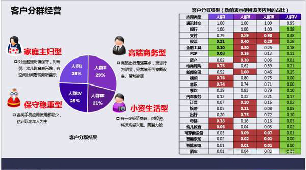 在對商圈人群完成360度用戶畫像后,可從不同維度實(shí)現(xiàn)對人群的分類管理。在已有的實(shí)踐嘗試中,年齡、婚姻狀況、車輛保有情況、性別、設(shè)備品牌、應(yīng)用偏好都可稱為進(jìn)一步交叉分析、聚類分析的基礎(chǔ)維度。結(jié)合該商業(yè)地產(chǎn)企業(yè)的自身需求,華錦億爵大數(shù)據(jù)技術(shù)團(tuán)隊以線上應(yīng)用偏好作為最重要的聚類基礎(chǔ),將商圈內(nèi)人群分為偏好差異明顯的幾種不同類型,從而便于把握不同類型客群的消費(fèi)特征,為商業(yè)主力客群的選定準(zhǔn)備了有力的數(shù)據(jù)支持。